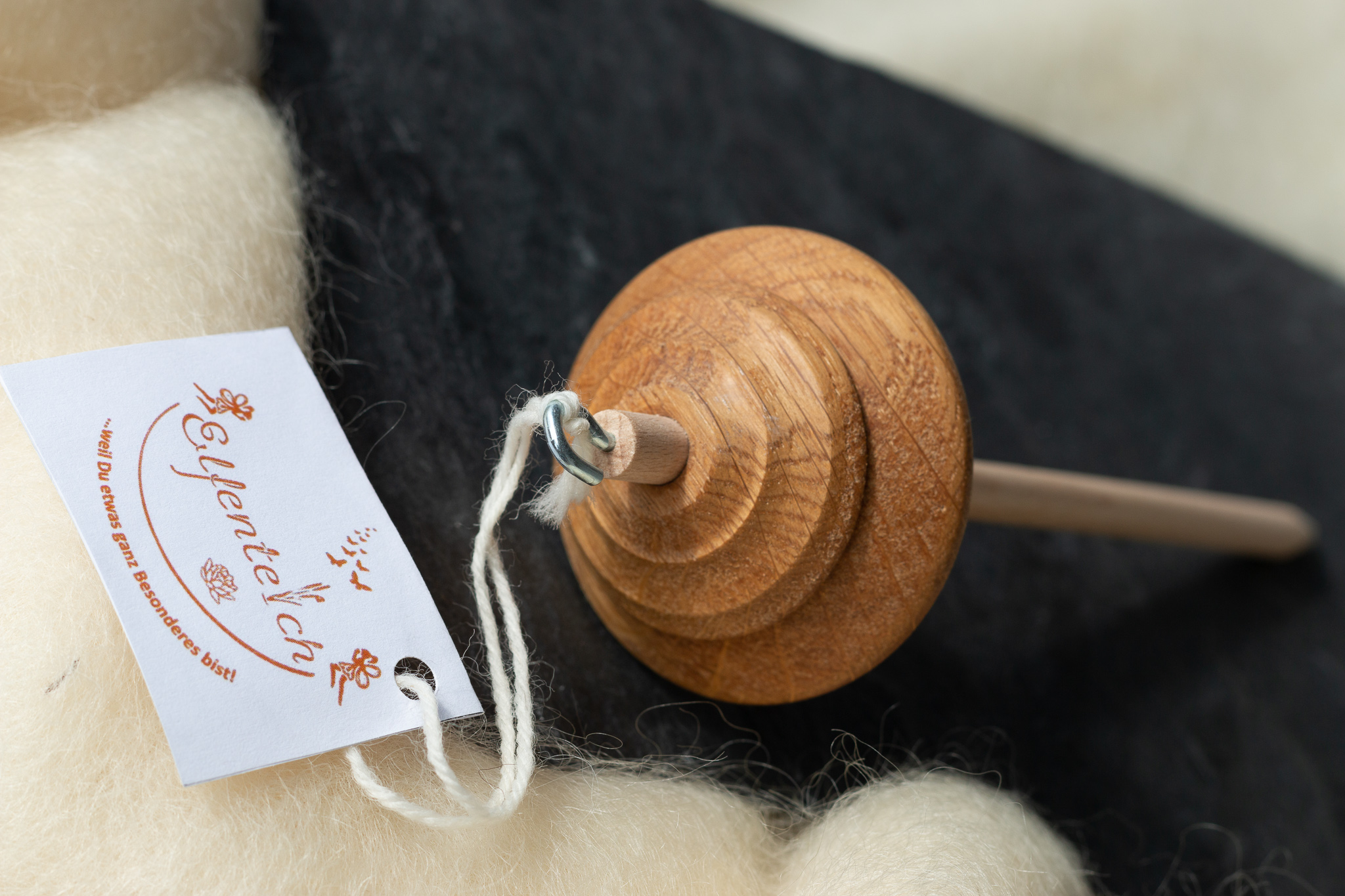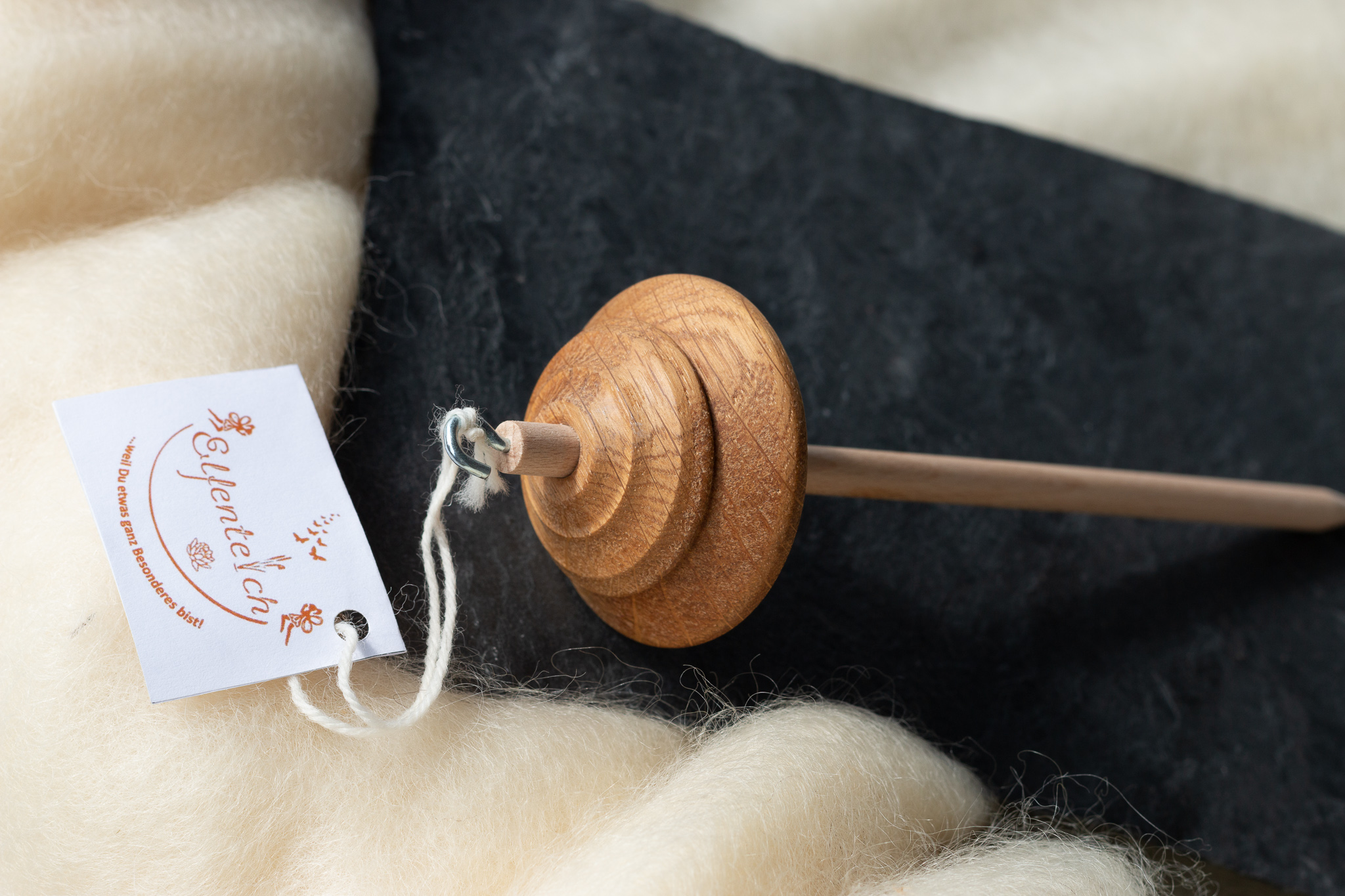 Kopfspindel mit handgedrechseltem Wirtel aus heimischem Eichenholz.